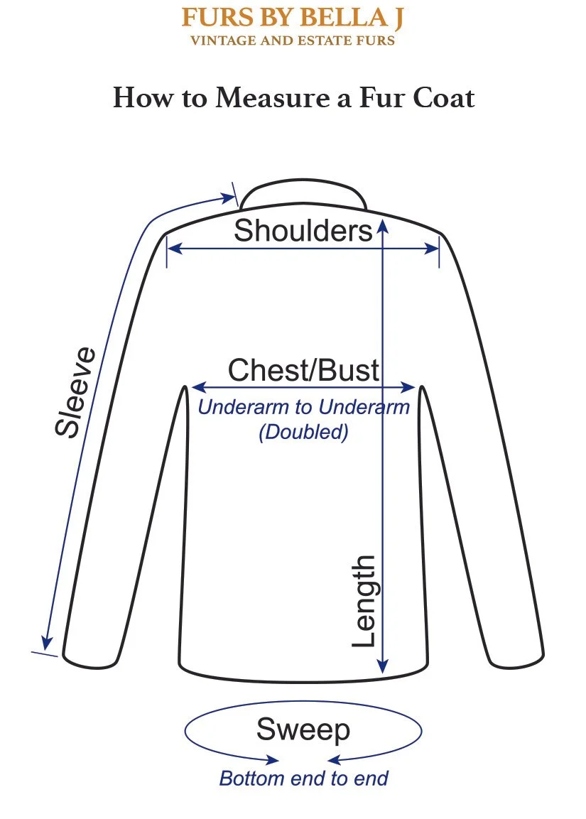 Please refer to our diagram above to help you with the measurements in selecting our Certified Vintage Furs. Please always choose a Certified Vintage Fur that is slightly larger, rather than too small. You will want room to wear a sweater underneath or to move freely in your fur coat without causing undue pressure to the pelts. See the measurements that are posted in our listings. If you need further assistance with sizing, please send us your height, weight, bust or chest measurement. You can email us at FursByBellaJ@gmail.com or send a text message to (650) 773-1246. We will help guide you to selecting a Certified Vintage Fur that will fit you best.